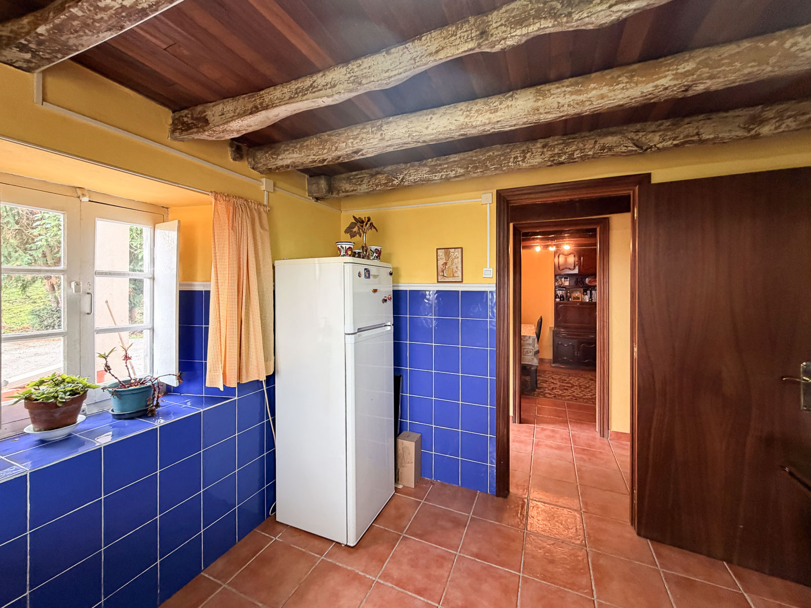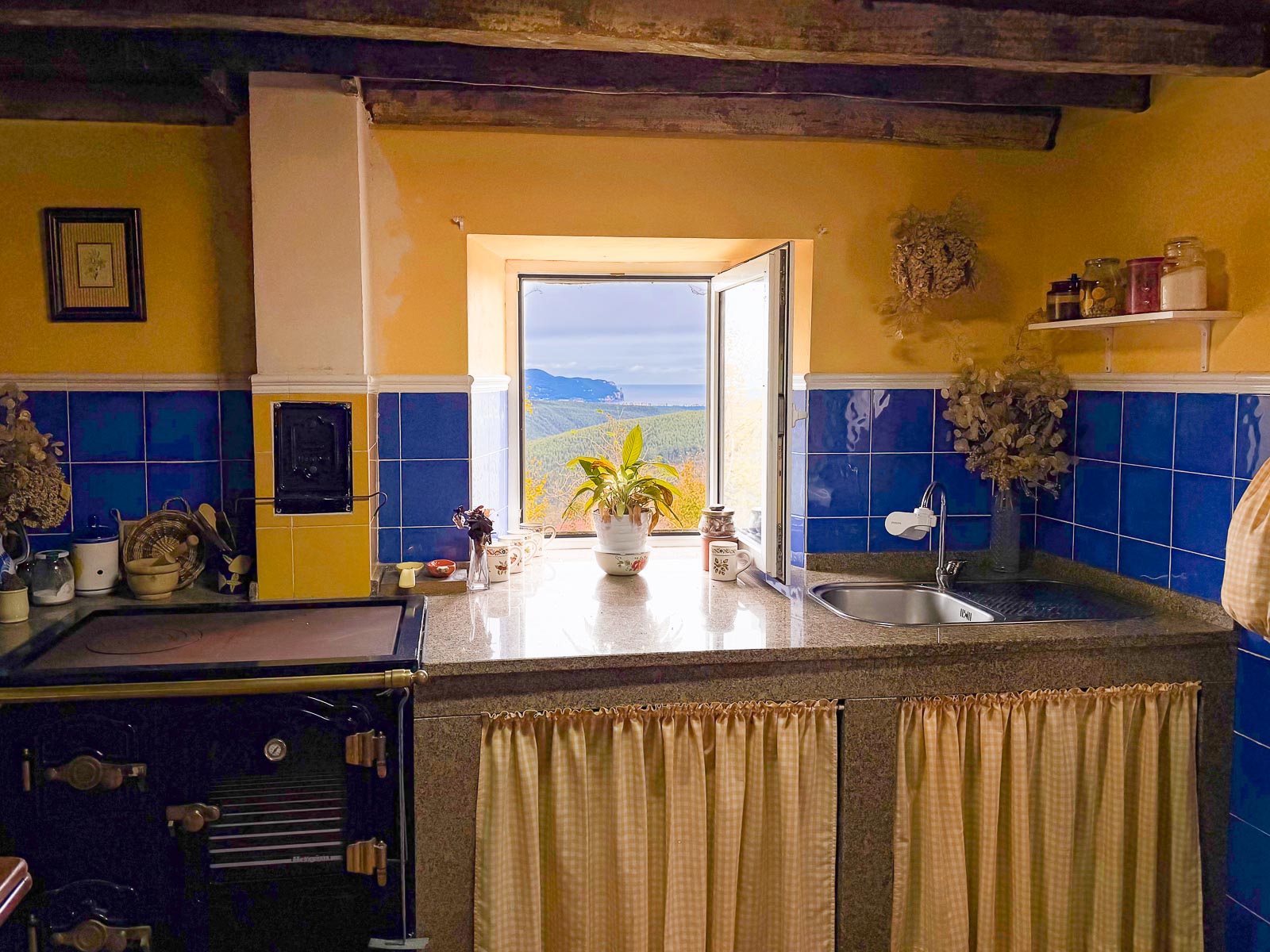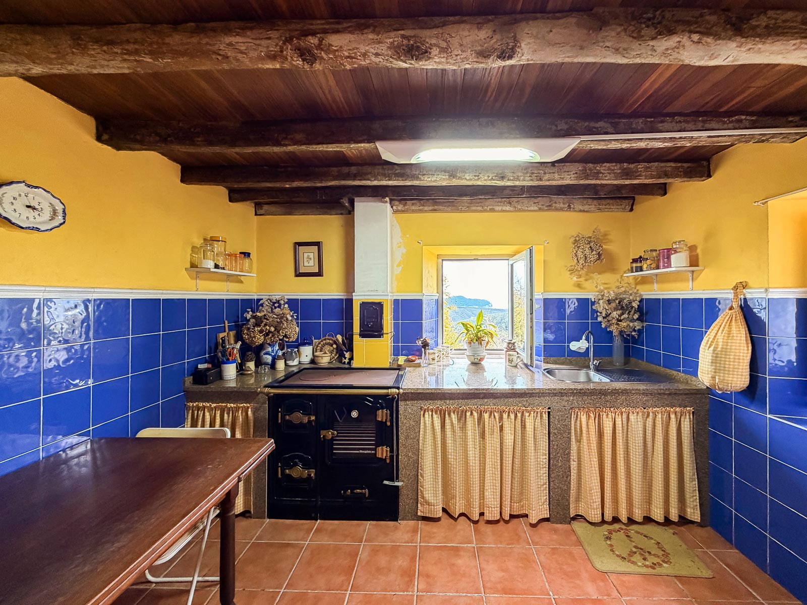La cocina “con cocina económica de Hergom” muy bien cuidada con una de las ventanas con vistas al mar, ¿te imaginas estar cocinando y viendo el mar? salón en planta baja, un baño y leñera y el acceso a la cuadra que se encuentra sin reformar.