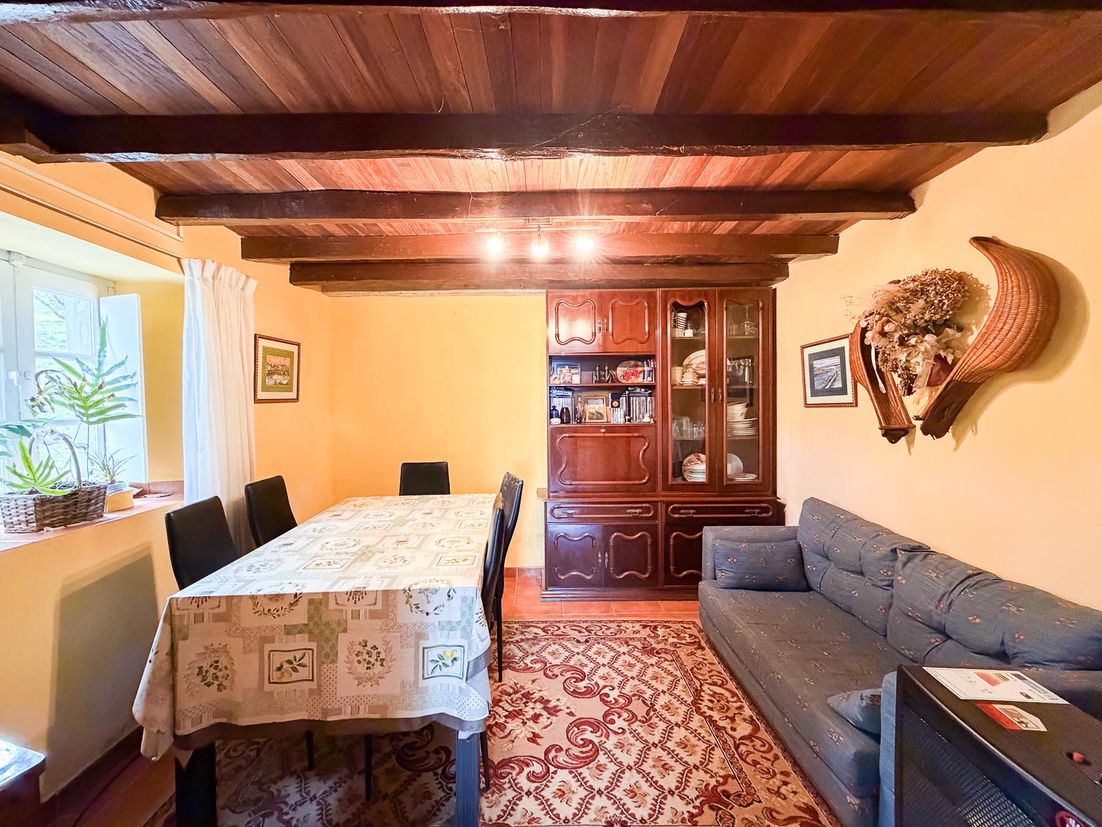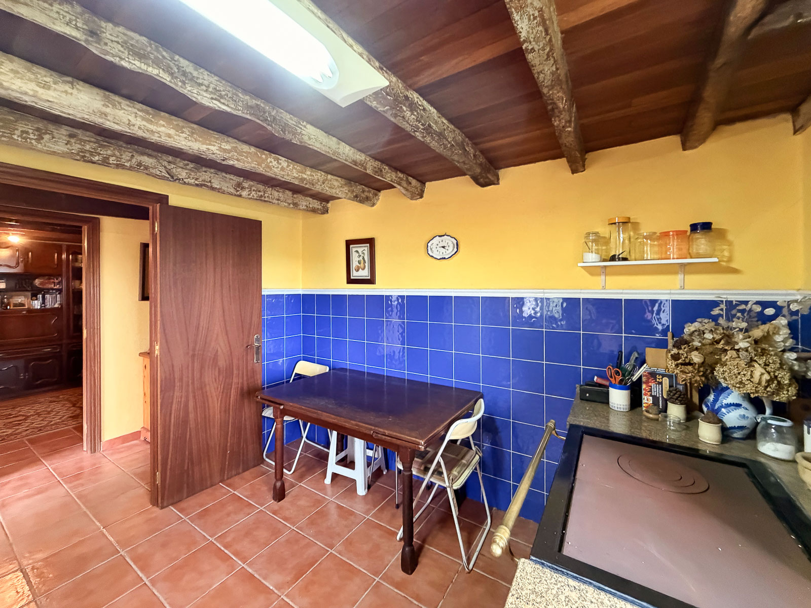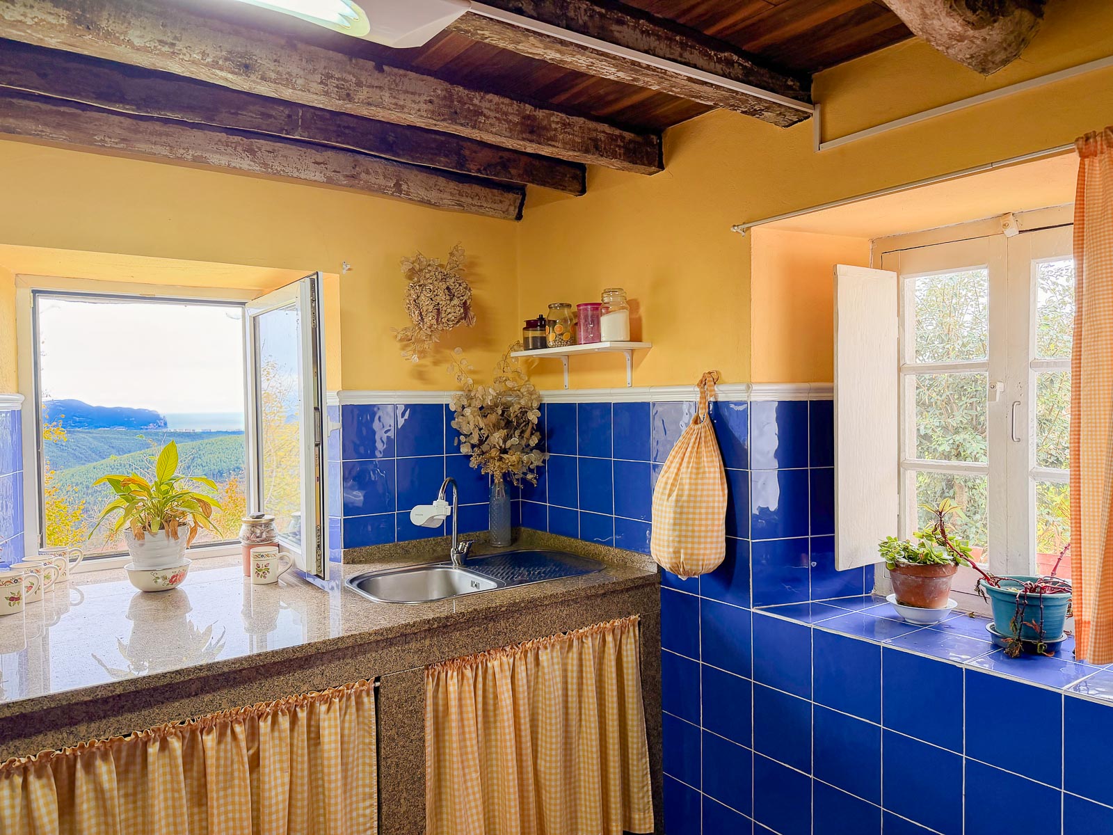 La cocina “con cocina económica de Hergom” muy bien cuidada con una de las ventanas con vistas al mar, ¿te imaginas estar cocinando y viendo el mar? salón en planta baja, un baño y leñera y el acceso a la cuadra que se encuentra sin reformar.