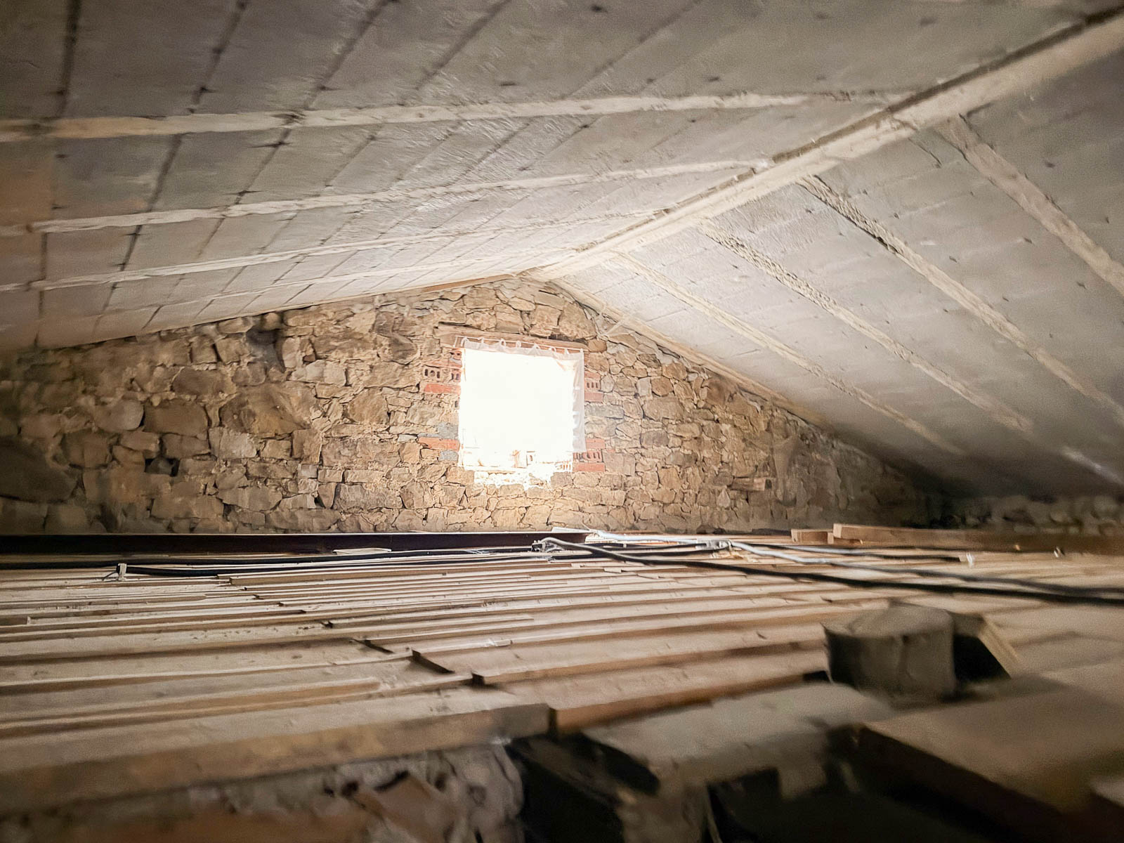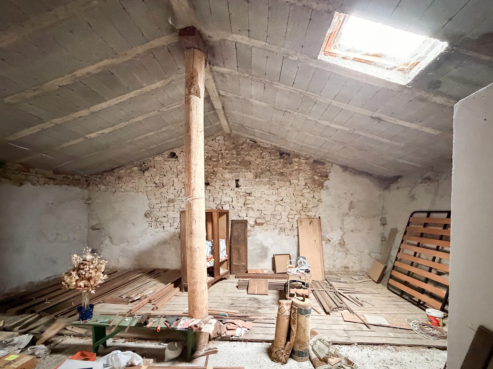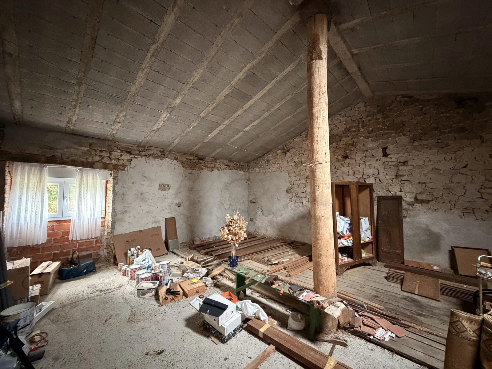 La casa es de piedra, bien cuidada pero requiere de actualizaciones, además de no estar terminada la obra de la zona de la cuadra. Tiene alguna ventana cambiada, como uno de los baños actualizado.