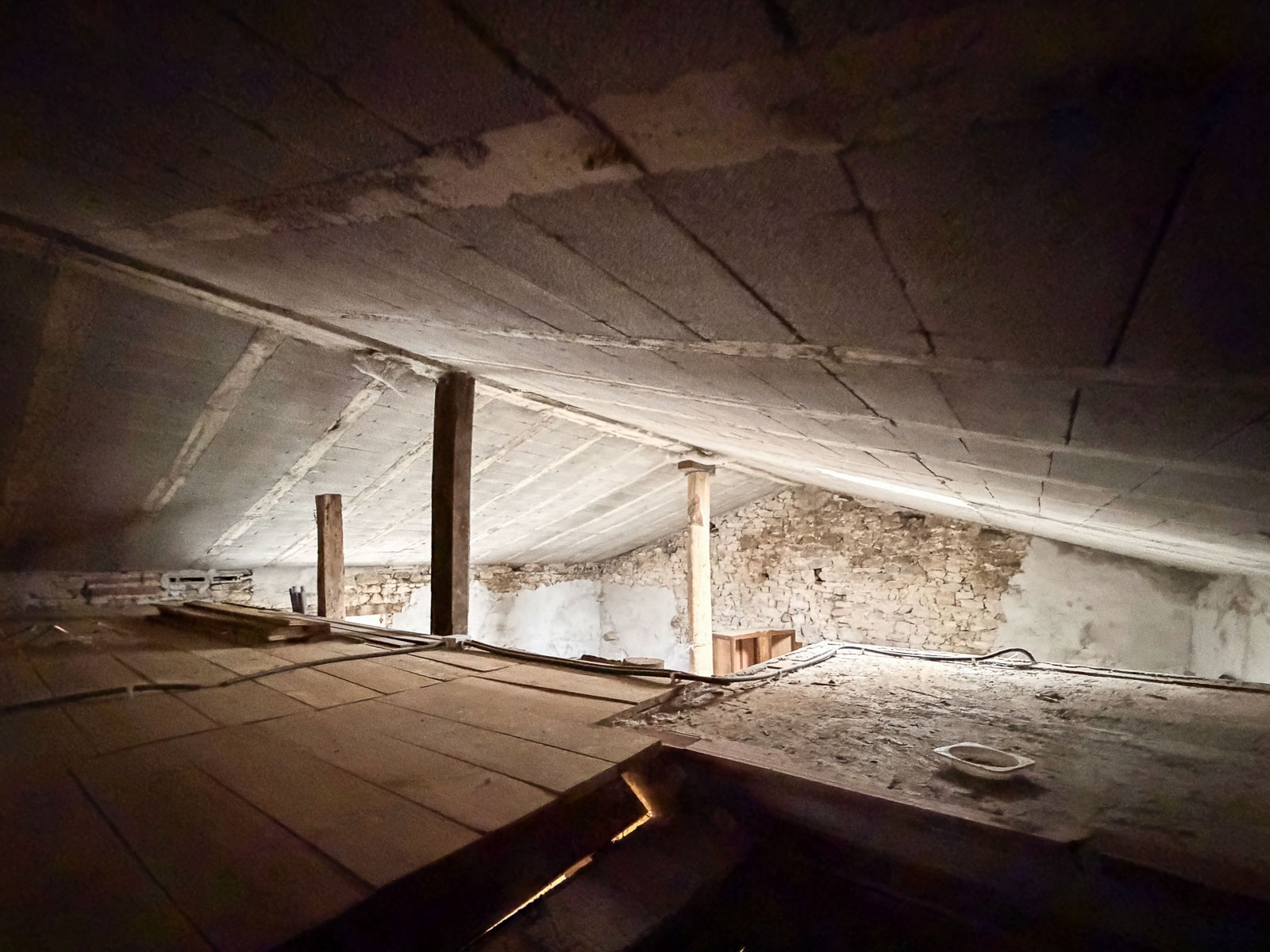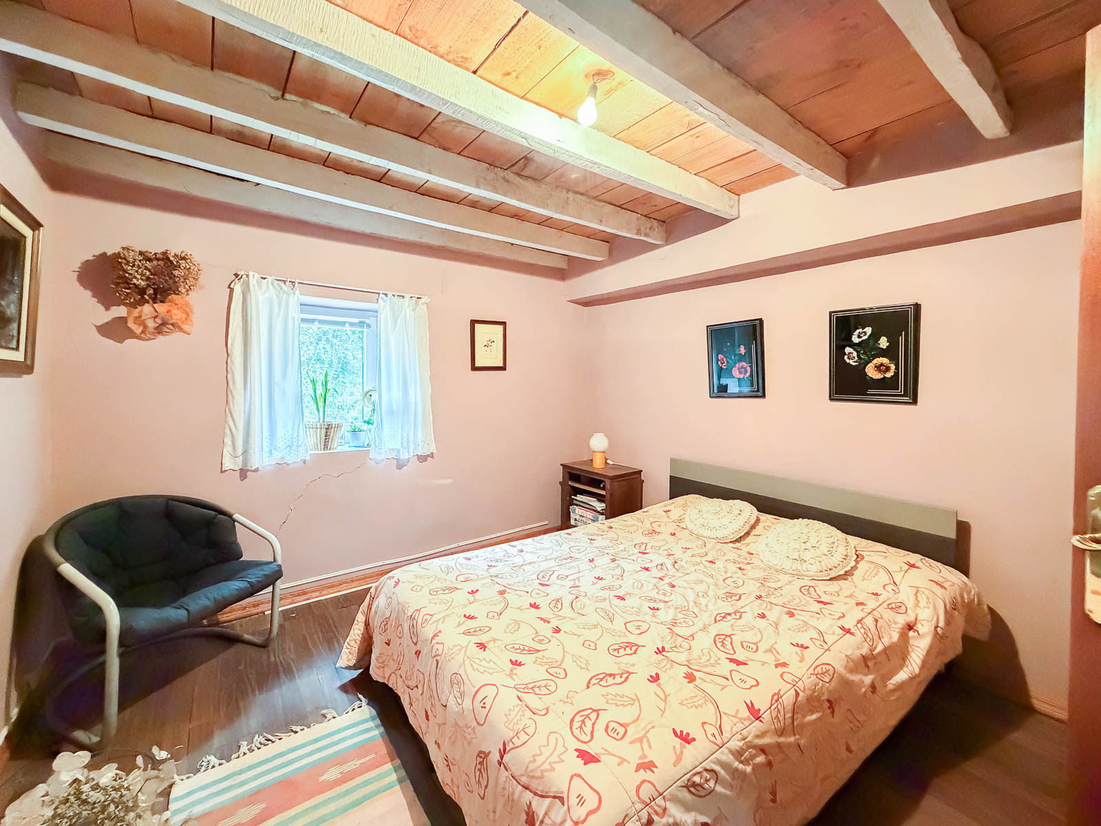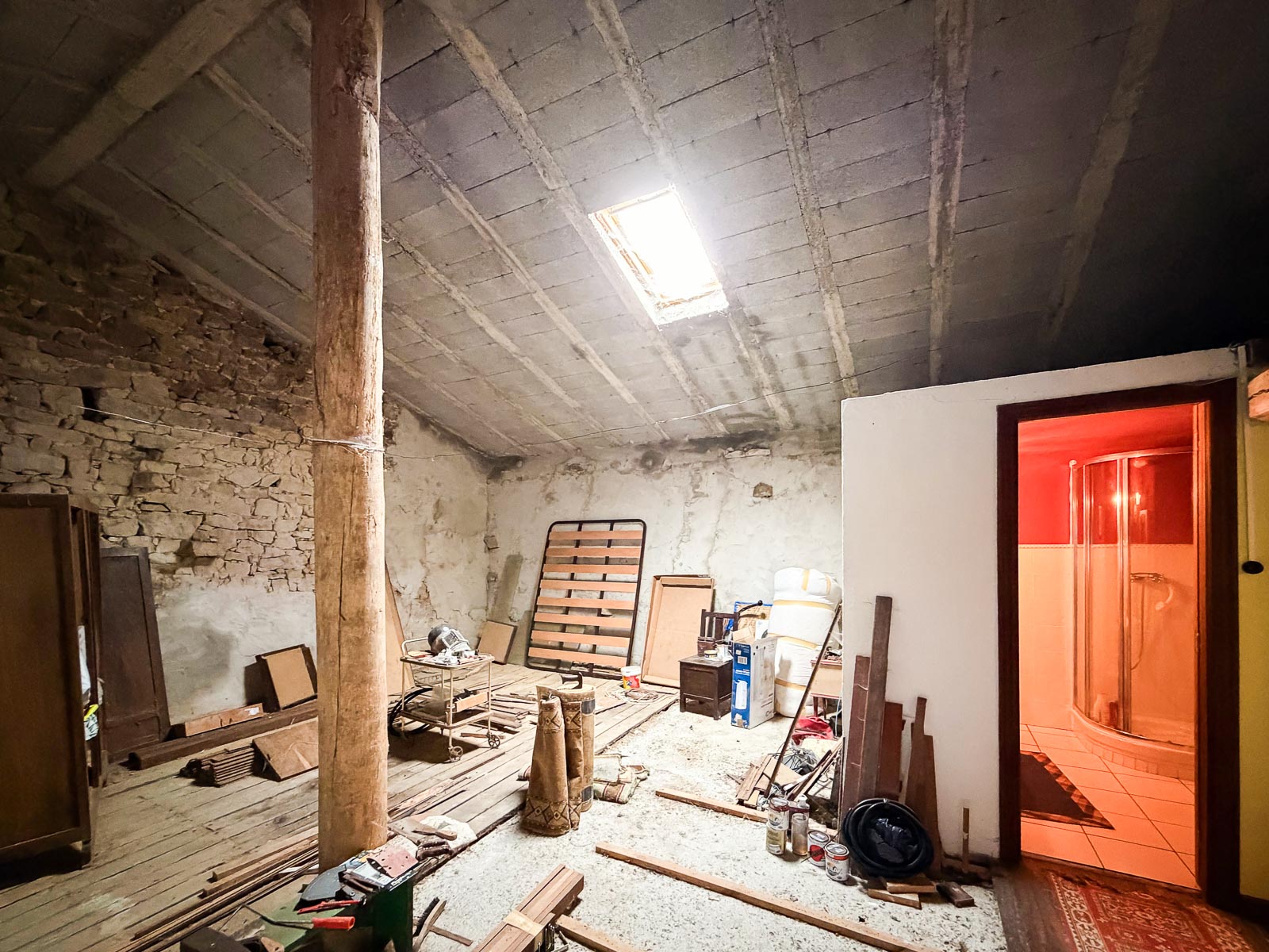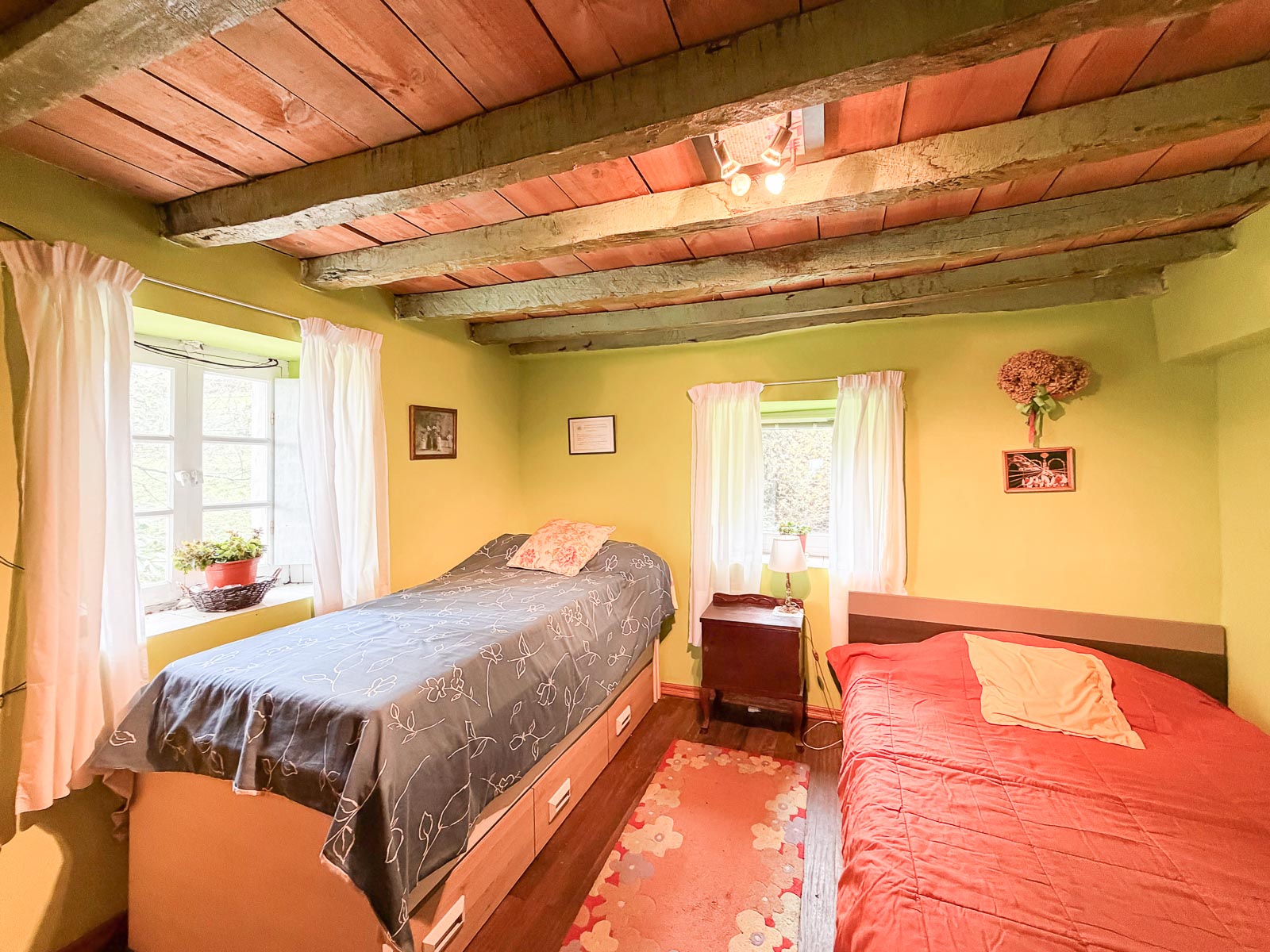 La casa es de piedra, bien cuidada pero requiere de actualizaciones, además de no estar terminada la obra de la zona de la cuadra. Tiene alguna ventana cambiada, como uno de los baños actualizado.